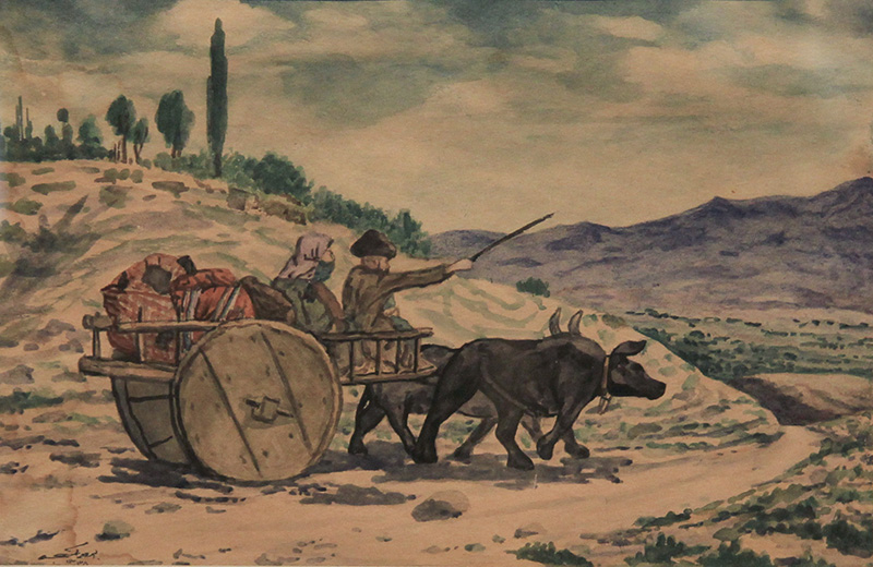 Onun karton üzərində yağlı boya ilə çəkilmiş "Mənzərə" şəklində isə hiss olunan isti və quruluğun təsirlərinə baxmayaraq, yaşıllığını qorumağa çalışan, yaşamaq üçün mübarizə aparan və boy atmağa, yaşıl qalmağa, öz gözəlliyini, mövcudluğunu saxlamağa can atan ağaclar təsvir edilib. "Evlə mənzərə" əsərində obyektlərin planlı şəkildə düzgün təsviri daha aydın sezilir və əsərə cəlbedicilik bəxş edir. Əsərdə dağların əzəməti və üfüqün genişliyi qarşısında evlərin sadə görüntüsü diqqəti cəlb edir. Qarşıdakı gölməçədə isə suların parlaqlığı, xüsusilə bu parlaqlıqda ətraf obyektlərin əks olunması böyük ustalıqla təsvir olunub. Bu sadə evlərin qarşısındakı başqa ağaclardan nisbətən ayrı, tək düşmüş bir ağacın da dik-dik duraraq göylərə can atan təsviri rəsmə əlavə məna və məzmun qatır. Sanki bu tək ağacın təsviri insanı bütün çətinliklərə rəğmən yaşamağa, öz varlığını sürdürməyə, problemlər qarşısında dik durmağa sövq edir.