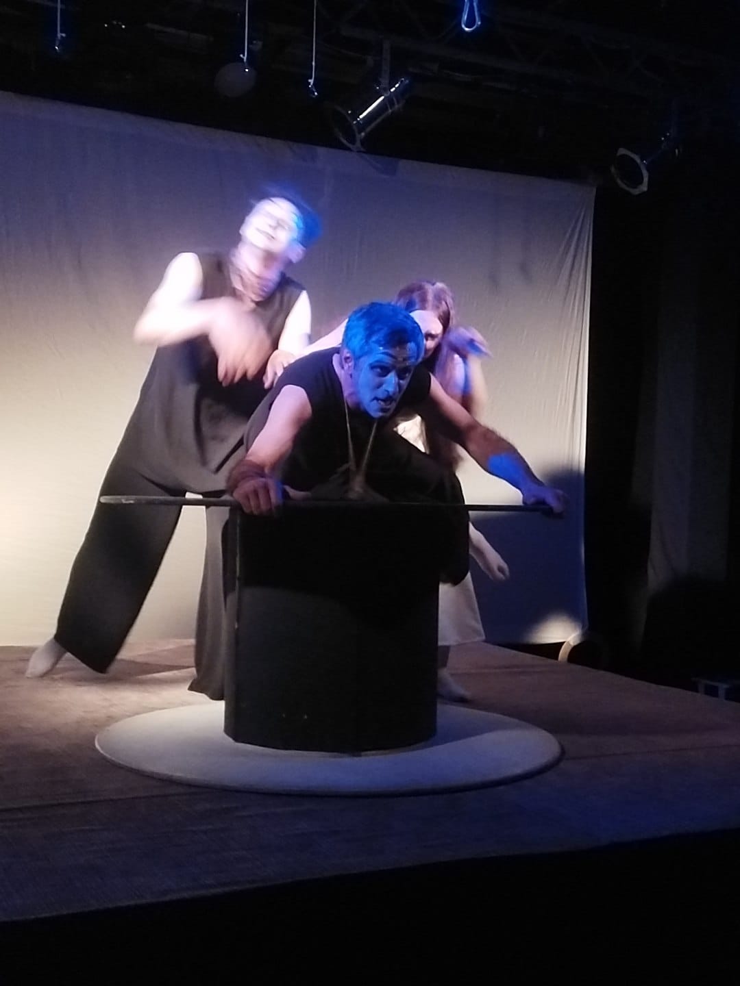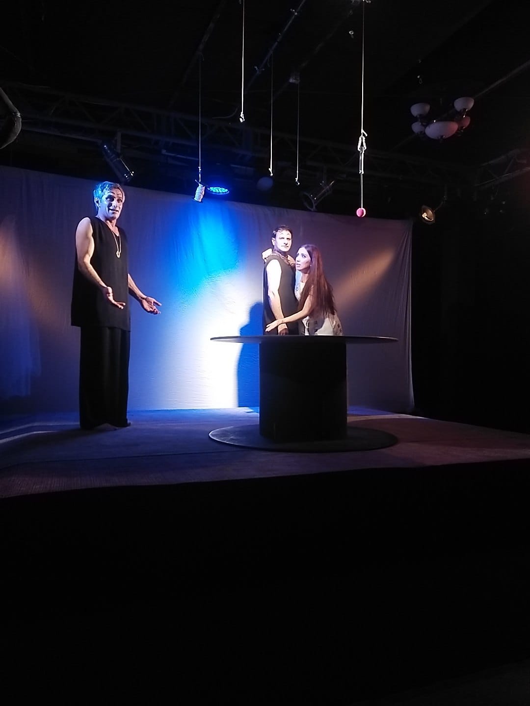 Tamaşada cəmi üç aktyor iştirak edir. Rolları Amid Qasımov, Elgün Həmidov və Mətanət Abbas ifa edirlər.
