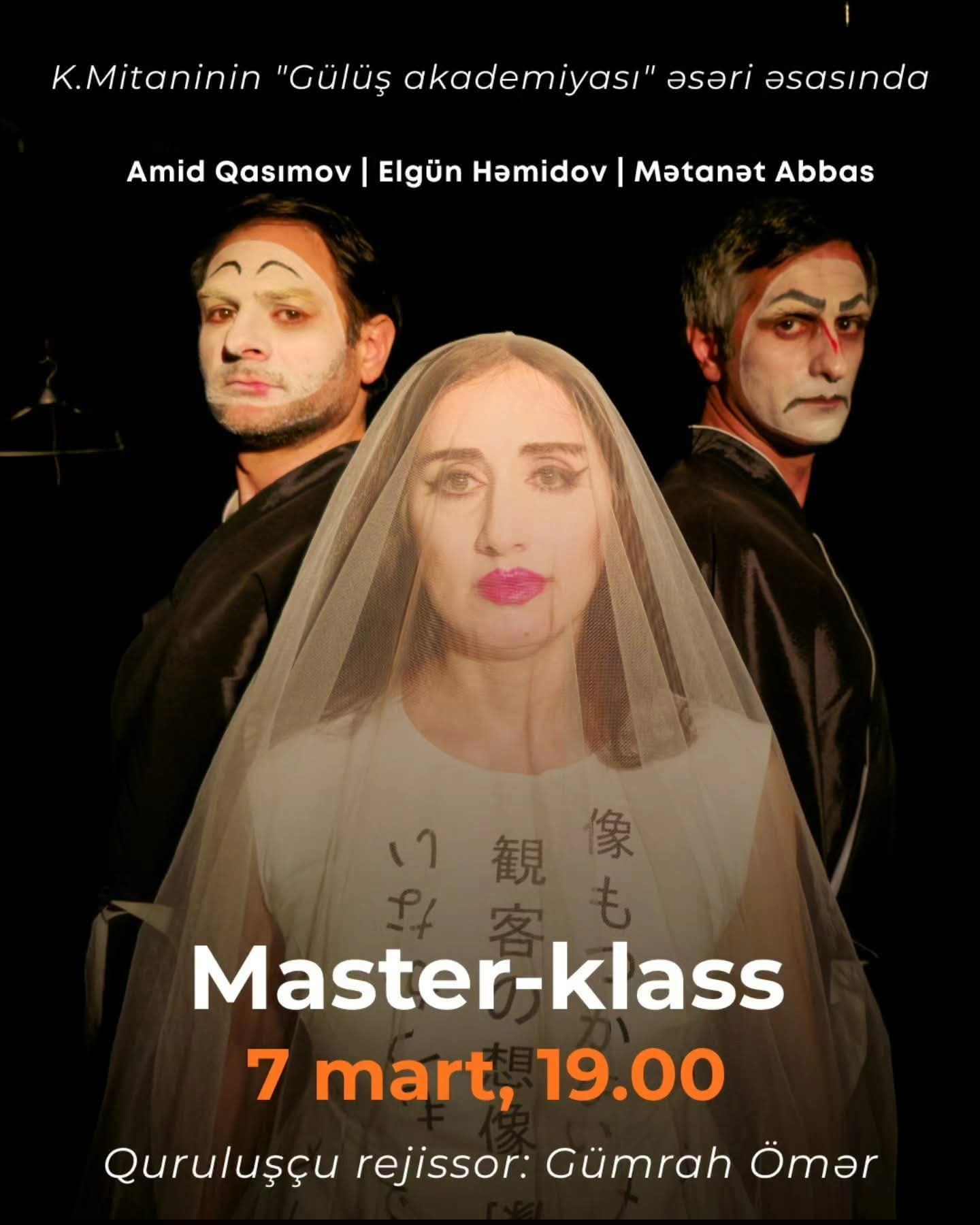 Bu günlərdə teatrın səhnəsində rejissor Gümrah Ömərin hazırladıgı “Master klass” tamaşasını izlədim. Tamaşa yapon dramaturqu Köki Mitaninin məşhur “Gülüş akademiyası” əsəri əsasında səhnələşdirilmişdir. Əsər (şərti olaraq) komediya janrında yazılsa da, ciddi ictimai və fəlsəfi mətləbləri özündə ehtiva edir. Əsərin mərkəzində gülüşün, yumorun və sənətin cəmiyyət həyatındakı rolu dayanır.